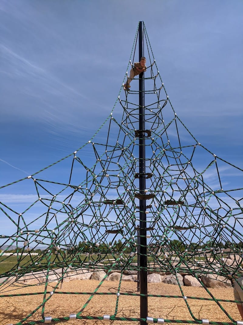 600 South Park in Hyde Park features a playground with a large climbing net, spinning toys, and slides, plus a big open field suitable for soccer and football. Tennis and pickleball courts sit adjacent to the play area, and a walking trail loops through the park. Restrooms and a drinking fountain are available, though shade is limited and there are no benches directly by the playground yet.