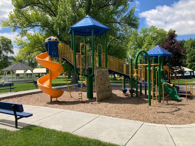 Richmond City Park offers a playground, basketball court, and tennis and pickleball courts, with pavilion space and restrooms available. Large trees provide good shade near the picnic benches, though the playground and seating areas could use more coverage on hot days. The tennis courts show some age, but the park is well-maintained overall. Note that the park entrance is on Park Lane (across from the Napa auto parts center), which can be tricky to find with GPS directions.