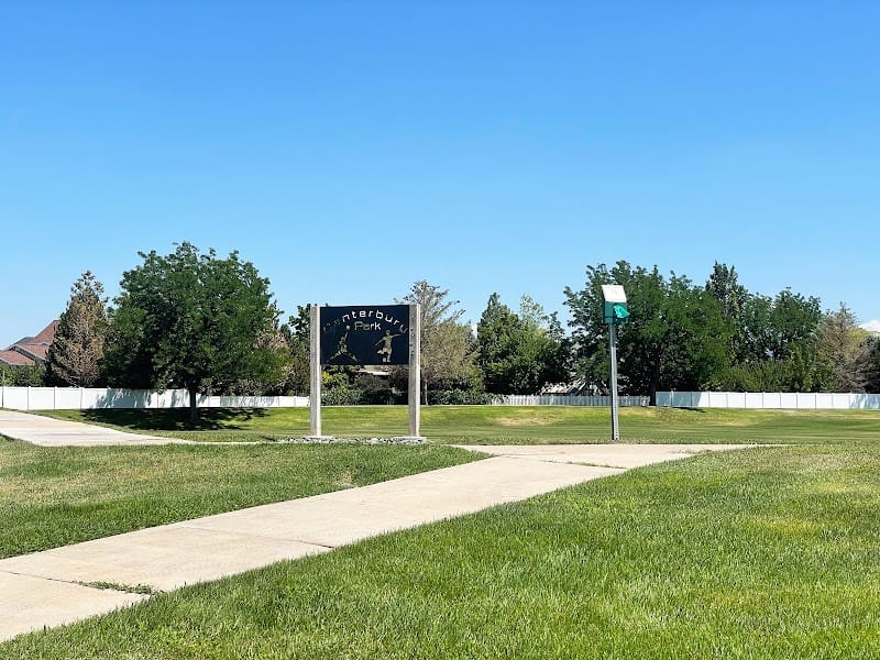 Canterbury Park covers a compact area in Syracuse with a mix of recreation options that work well for neighborhood use. The park features a basketball court, sand volleyball court, and a small playground alongside a picnic pavilion and restrooms. A walking trail loops around the property, which includes a stormwater retention area on the western edge. Shade trees line the perimeter but are still relatively small, so the open grassy areas can get full sun during peak hours.