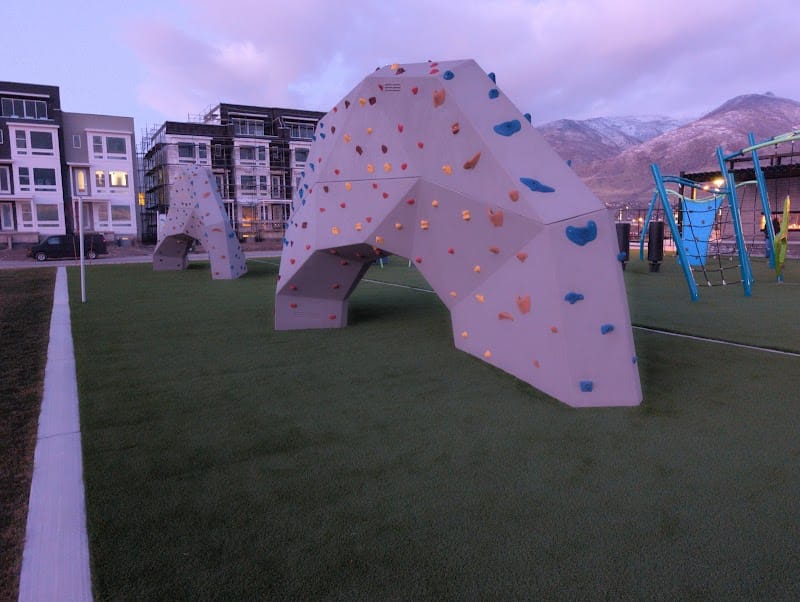 Ivy Acres Park in Farmington goes well beyond typical playground equipment with a timed obstacle course, timed sprint track, climbing walls, oversized slides, and a lit globe-shaped art installation. The park also includes a splash pad, pickleball and basketball courts, a performance stage, a seating area with a fireplace, permanent cornhole setups, and a 9-square court spread across large grassy areas connected by walking paths. With restrooms on-site and this many activity options for elementary-age kids and older, it's designed for extended visits, though shade is limited and there are reportedly no trash cans available.
