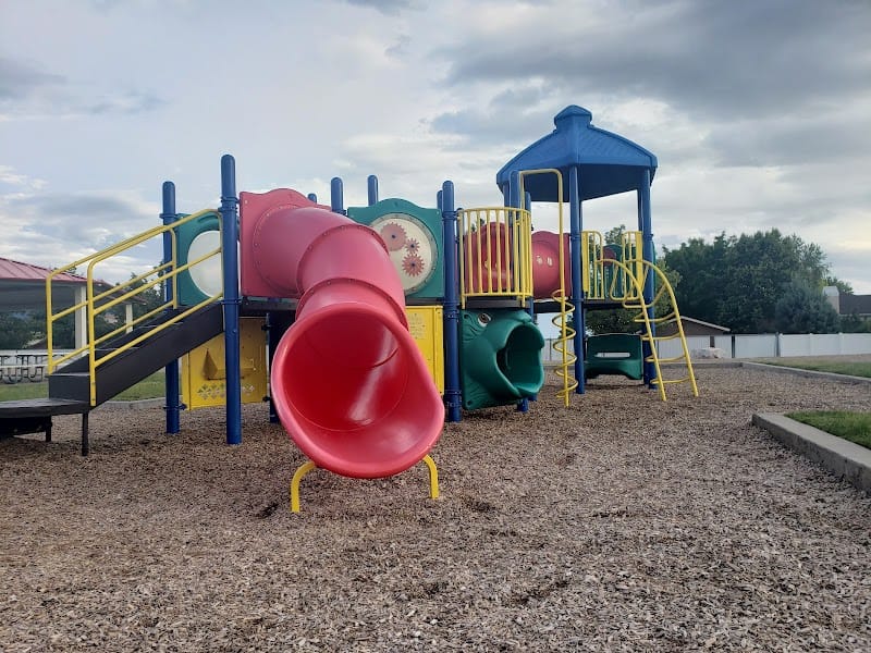 Sand Ridge Park in Layton covers plenty of open ground with a paved walking trail that's popular for daily exercise. The park includes both basketball and tennis courts, a playground, and multiple picnic setups including one large covered pavilion plus smaller individual picnic spots scattered under trees. Restrooms are on-site, and grilling facilities are available if you're planning a cookout. The trees provide some shade over the picnic areas, though the open spaces and courts get full sun.