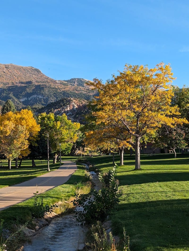 Ann J. Gardner Canyon Park sits along Coal Creek in Cedar City, offering shaded play areas and the pleasant sound of running water. The park includes restrooms, a covered pavilion, a walking trail, and a sandbox, with enough tree cover to provide relief on hot summer days. The soft grass areas give kids room to run, and the location serves as a convenient stop for families exploring the surrounding southern Utah region. Parking is available on site, making it accessible for a quick visit or longer afternoon.