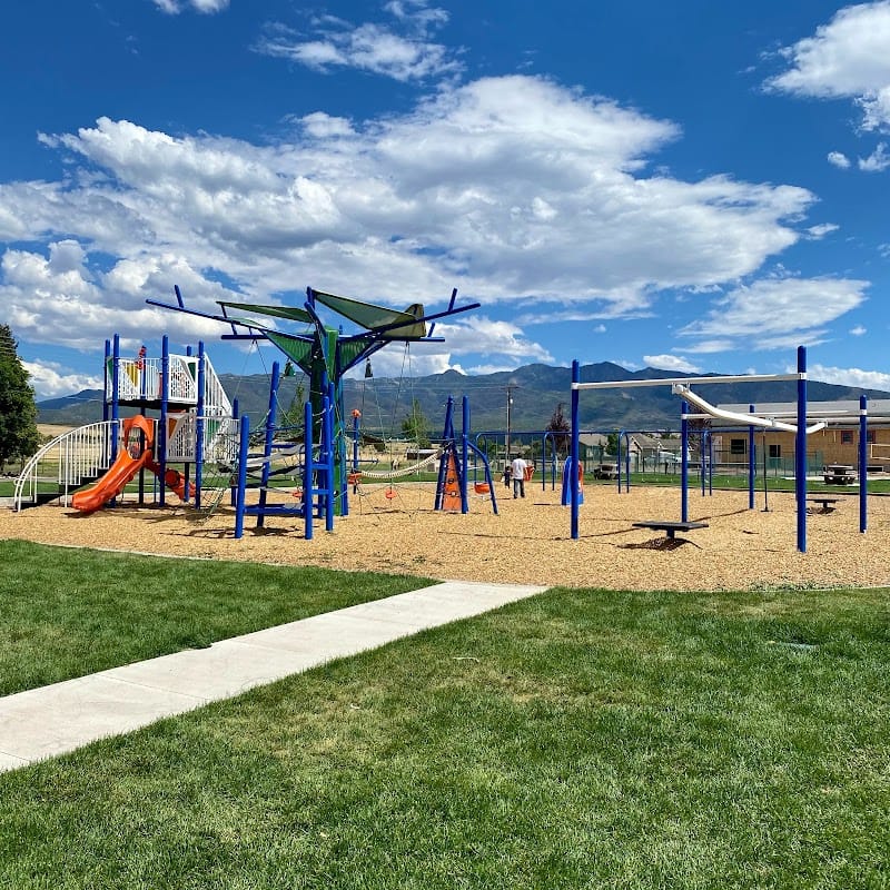 Fillmore City Park offers more than expected for a small-town stop, with three separate playground areas, a splash pad for hot summer days, and a skate park all in one spot. The park has plenty of mature trees providing good shade coverage, along with a pavilion and multiple picnic tables for families settling in for lunch. Restrooms are available on-site, and the city visitor center shares the same location if you need information about the area. The playground equipment includes tan-colored swings designed for adults with infants, making it genuinely accessible for parents with young babies.