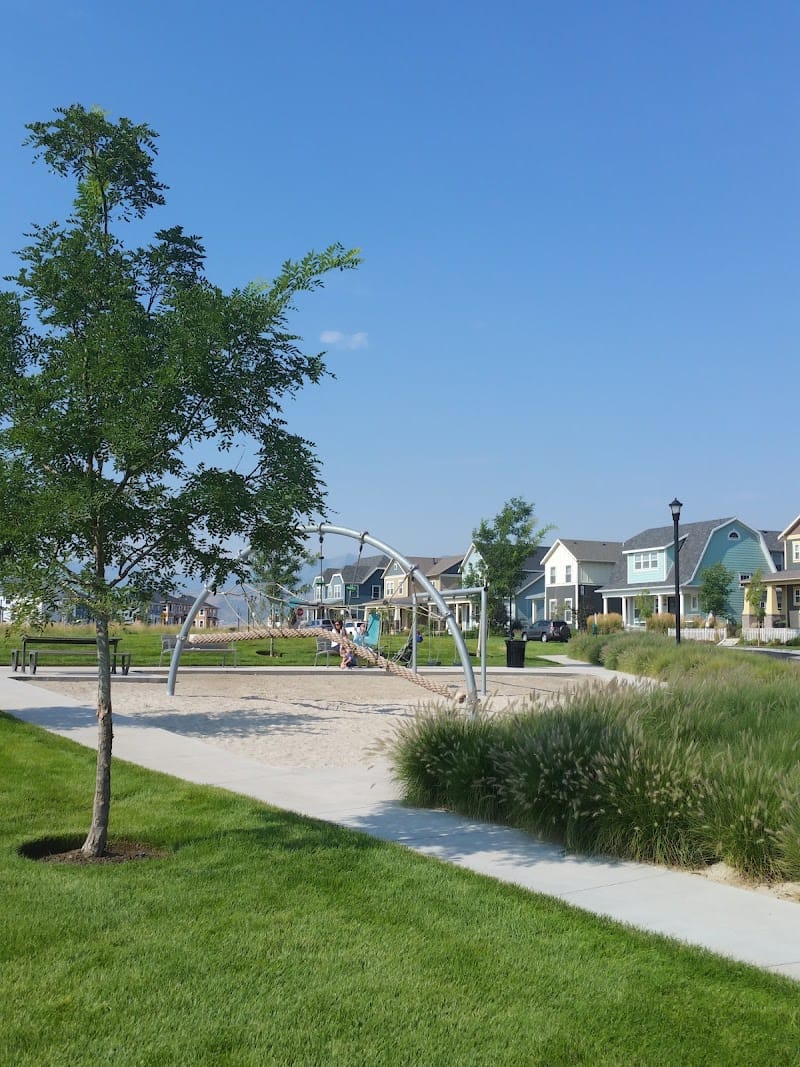 Bowstring Park is a small community park in Daybreak with a playground that includes swings and a volleyball court. The park offers some shade coverage and has hills that work well for kids to climb and roll down. It's a straightforward spot for families in the neighborhood, though it lacks restrooms or other major amenities.