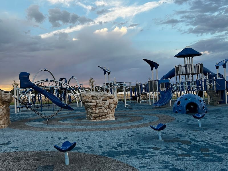 Sierra Newbold Memorial Playground spans a large area with play equipment designed for multiple age groups, from toddlers to older kids. The park includes a splash pad for summer cooling, a skate park, tennis and pickleball courts, and a walking trail that loops through the grounds. Shade structures cover portions of the playground, though the open layout means wind can pick up across the space. Restrooms and drinking fountains are available seasonally from roughly April through September, so plan accordingly during the colder months.