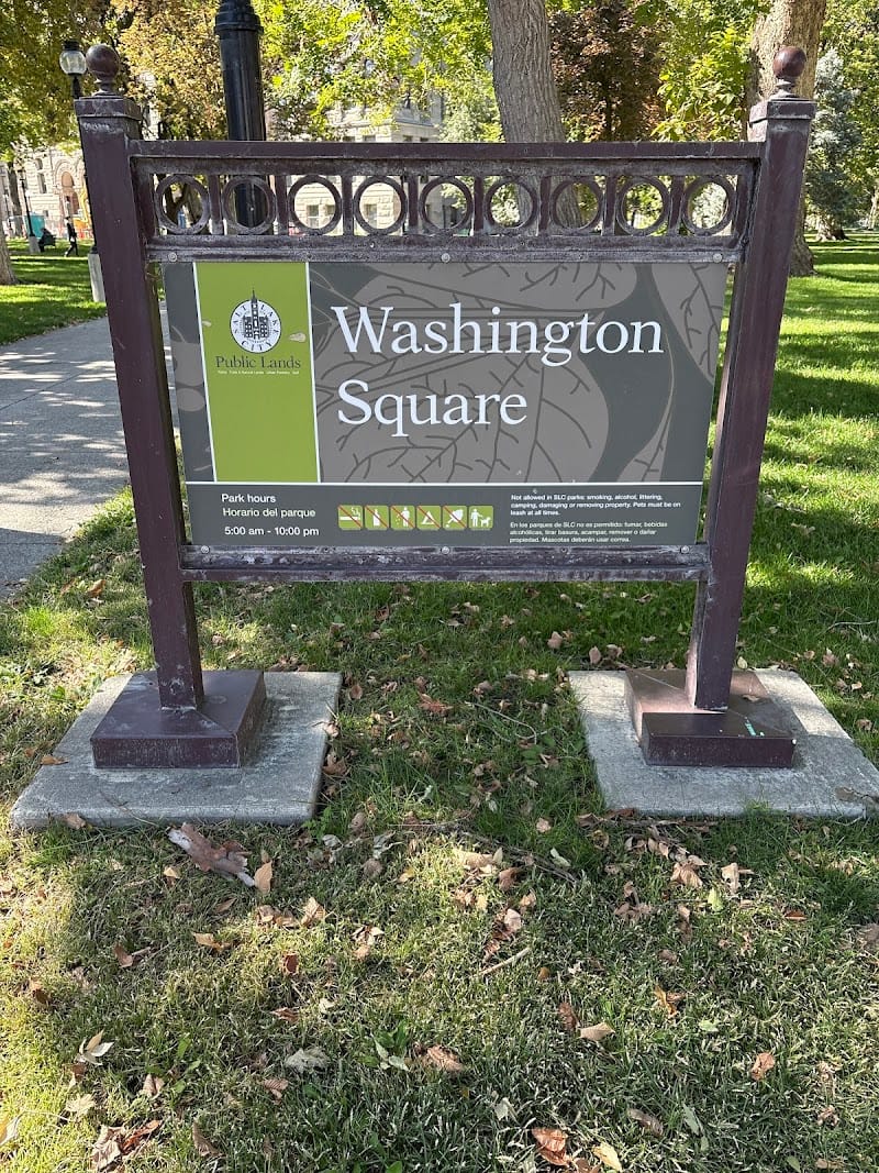 Washington Square sits in the heart of Salt Lake City and features a walking trail that loops through mature trees and seasonal flower gardens. The park surrounds a historic building and includes an art installation visible from the parking area. Shade is plentiful thanks to the established tree canopy, making it a comfortable spot during warmer months, though there are no restrooms or traditional playground structures on site.