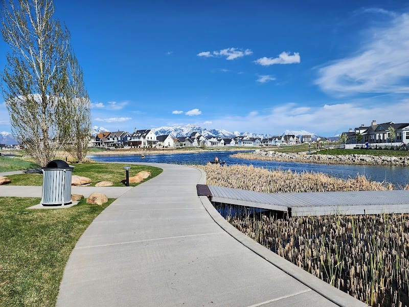 West Beach Park sits along Oquirrh Lake in the Daybreak community, offering lake views and open space for families. The sandy beach area provides a spot to relax by the water, though the lake attracts ducks and geese, so watch your step. Shade is limited, so plan accordingly on sunny days. The park works well for young kids who want to play near the water or enjoy the scenery across the lake.