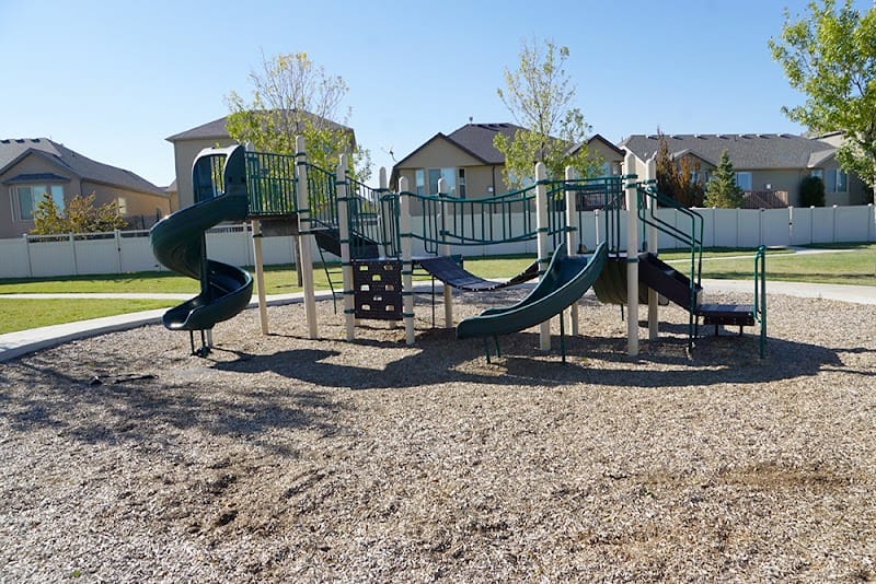 Western Springs Central Park in Riverton centers around a large open field with a small playground and covered picnic pavilion. The playground includes a bridge feature with an unusually steep incline that younger kids may find challenging. The park doubles as a popular spot for dogs, and shade is available near the pavilion area.