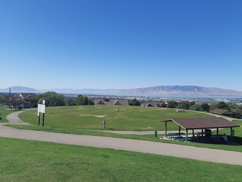 Hill Park offers views of Pleasant Grove and the surrounding area from its elevated position in a residential neighborhood, though benches aren't positioned near the edge for viewing. The playground has slides suited for toddlers and preschoolers, and picnic tables are available closer to the main street side. Shade is limited, so plan accordingly, and note that sprinklers run at night which can make parts of the grass wet.