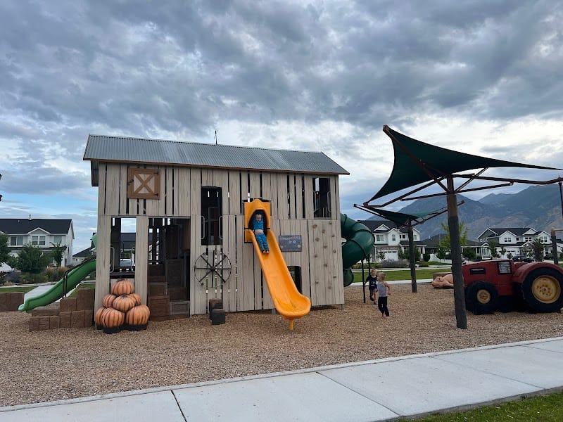 Legacy Farms Park stands out with its farm-themed playground that includes a tall barn structure alongside traditional play equipment. The park has slides and climbing features sized for both younger children and elementary-age kids, plus swings, a basketball court, and a covered pavilion. Restrooms are available on-site, and there's enough shade to make summer visits more comfortable. The agricultural theme gives it a distinct character compared to standard neighborhood parks in the area.