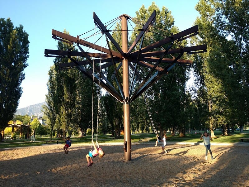 Nielsen's Grove Park in Orem stands out for its botanical character, featuring a reflecting pool, pond, and greenhouse surrounded by well-maintained flower beds and plantings. The park includes a walking trail that winds through the landscaped grounds, along with a pavilion and picnic areas that take advantage of the mature shade trees. Restrooms are available on-site, and the accessible pathways make it easy to explore the gardens at any age. It's more of a strolling and picnicking destination than a high-energy play spot, ideal for those wanting a quieter outdoor setting.