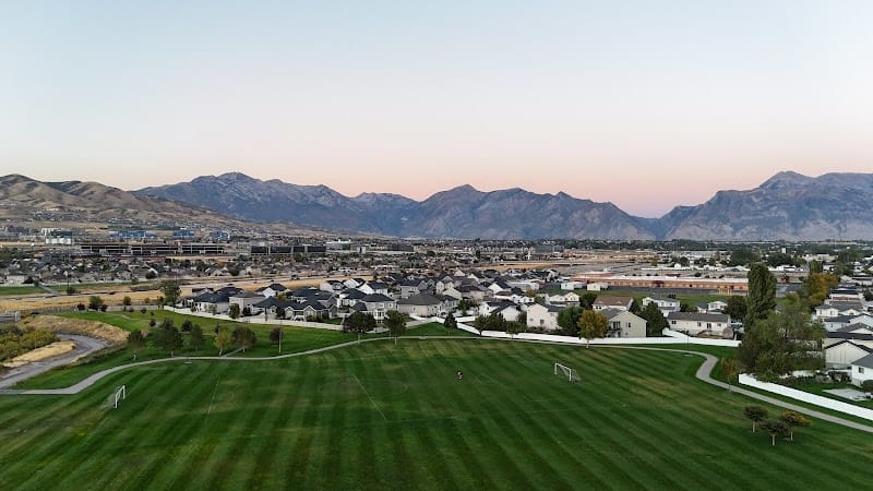 Olympic Park in Lehi offers open green space with mountain views and room to spread out for activities or picnics. The park includes a walking trail, pavilion for shade, and restrooms, making it comfortable for extended visits. With accessible paths and plenty of room to roam, it works well for dog walking, casual sports, or letting kids explore without the park feeling cramped.