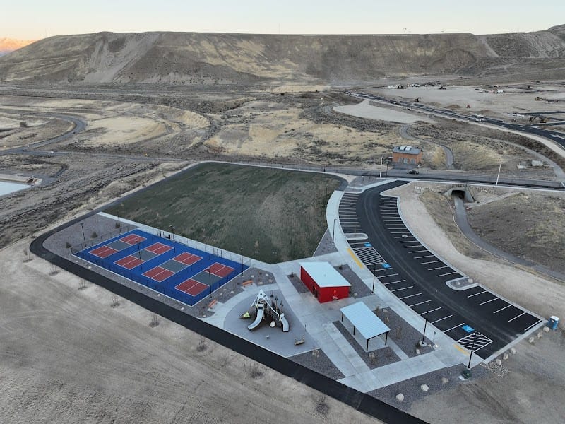 Shadow Ridge Park in Lehi offers a climbing wall and monkey bars that give older kids a solid challenge, plus pickleball courts for adults looking to get a game in. The park includes restrooms and a walking trail that loops the property, making it convenient for families planning to stay awhile. Shade is limited across the open layout, so plan accordingly on hot summer days. The mix of equipment works for toddlers through older children, though the climbing features tend to attract the elementary school crowd.
