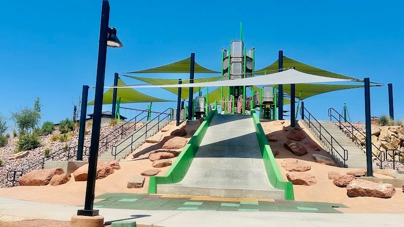 Fossil Falls Park offers a playground with swings and slides alongside the Virgin River, with a small waterfall visible from the park. The site includes a walking trail for exploring the riverside area, a sand volleyball court, and a pavilion with shade and restrooms. The playground equipment is geared toward kids ages 4 and up rather than toddlers, though the open grass and trail make it suitable for a range of ages. Summer temperatures in St. George climb high, so plan accordingly when visiting.